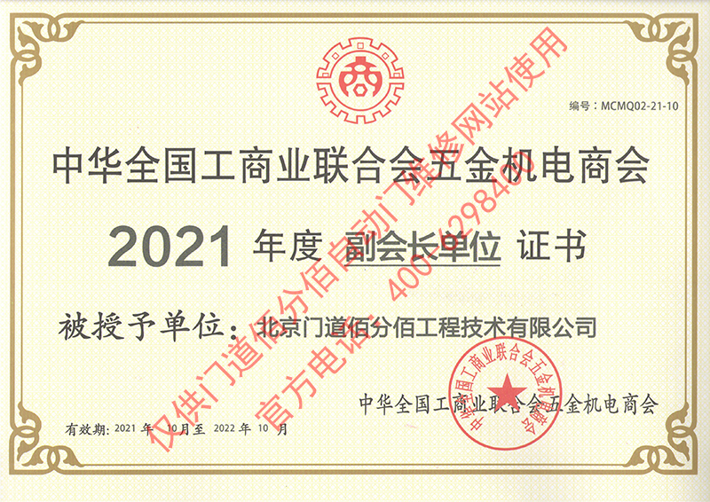 门道佰分佰2021年度全国工商联合会五金机电商会副会长单位
