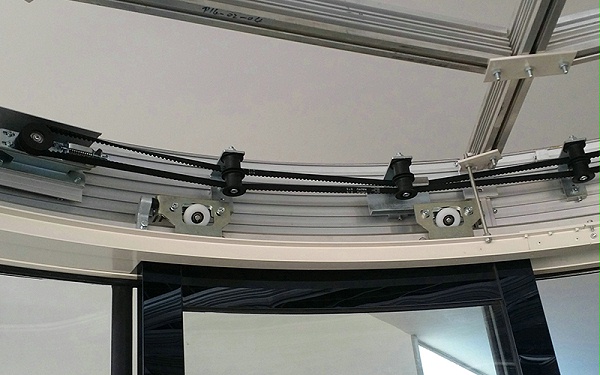 每扇弧形门上方一边配有动滑轮支架,另一边除动滑轮支架外还需动滑轮支架上放M4X12螺钉固定不动有联接板,在联接板上再装传动带标准件,用以门页与同步皮带的联接。